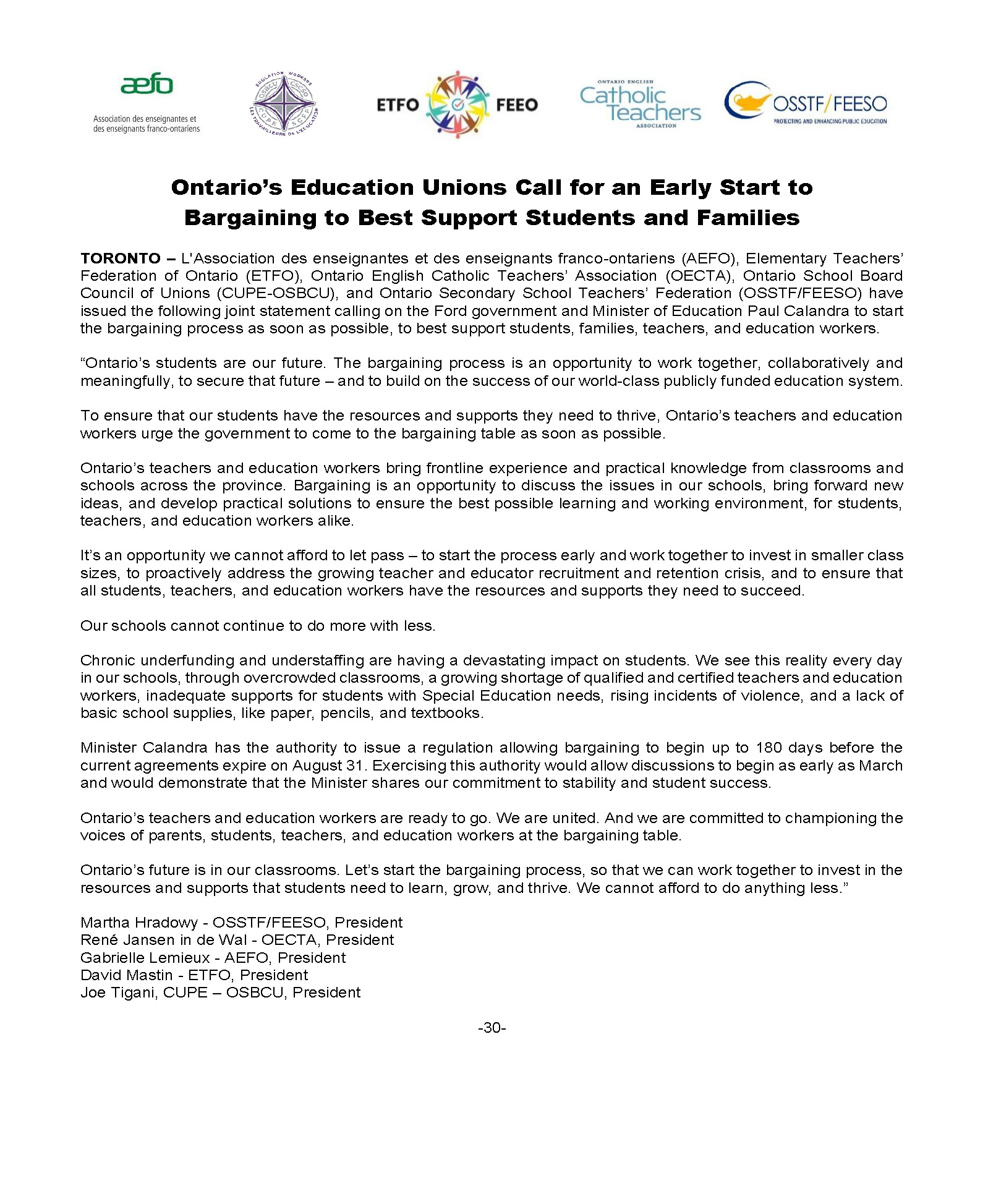 TORONTO – L’Association des enseignantes et des enseignants franco-ontariens (AEFO), Elementary Teachers’ Federation of Ontario (ETFO), Ontario English Catholic Teachers’ Association (OECTA), Ontario School Board Council of Unions (CUPE-OSBCU), and Ontario Secondary School Teachers’ Federation (OSSTF/FEESO) have issued the following joint statement calling on the Ford government and Minister of Education Paul Calandra to start the bargaining process as soon as possible, to best support students, families, teachers, and education workers.